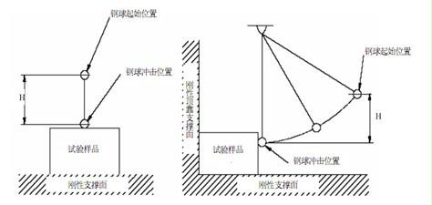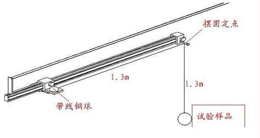 安装好“带线的钢球”,根据试验样品调整好钢球的高度(垂直距离为1.3m);按动释放按钮,钢球自由摆落至试验样品上。